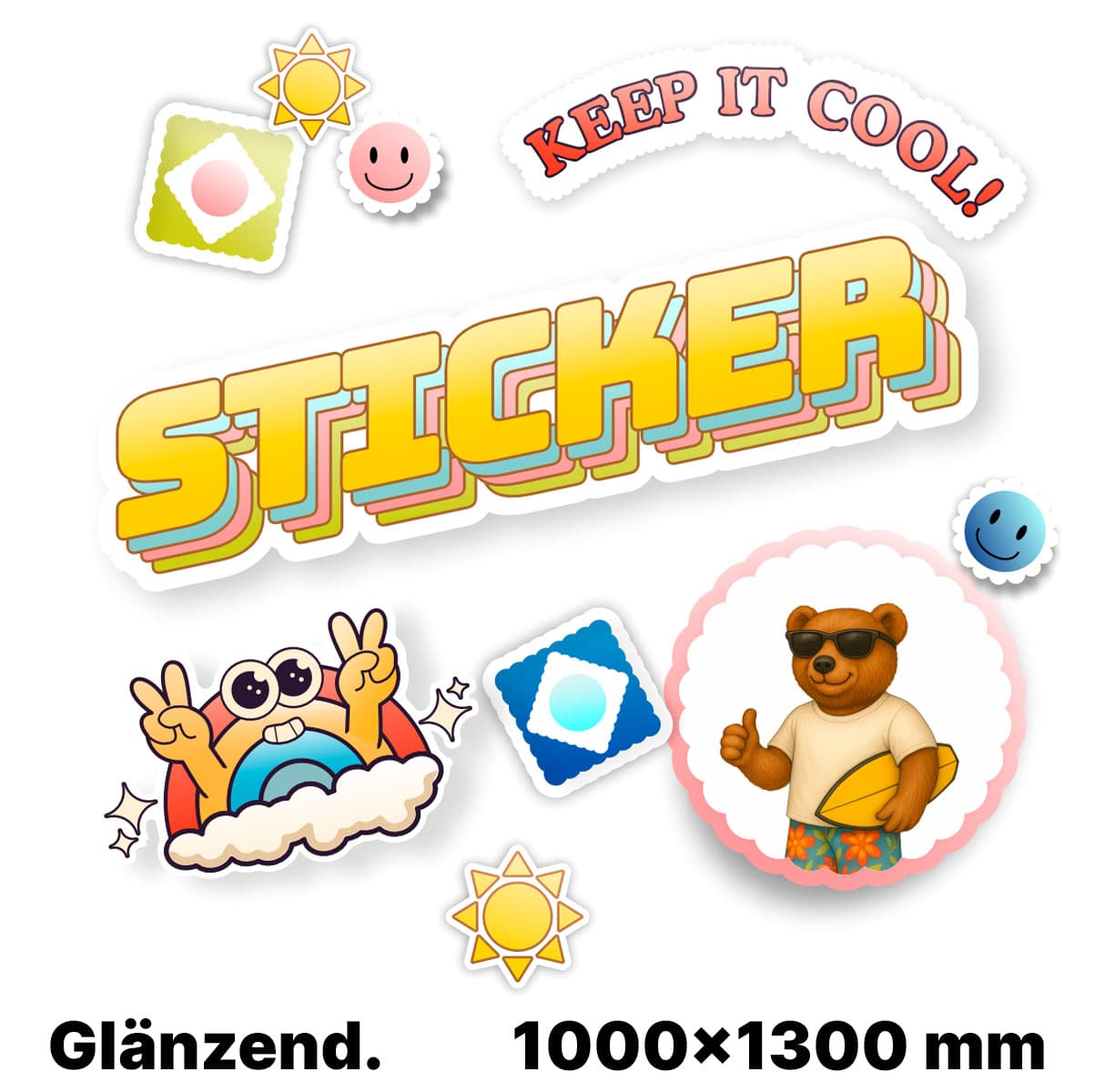 - Wir empfehlen bei Aufklebern (bedruckte Klebefolie) 2mm Anschnitt, weil bei randabfallenden Motiven produktionsbedingt weiße Schnittkanten sichtbar sein können.